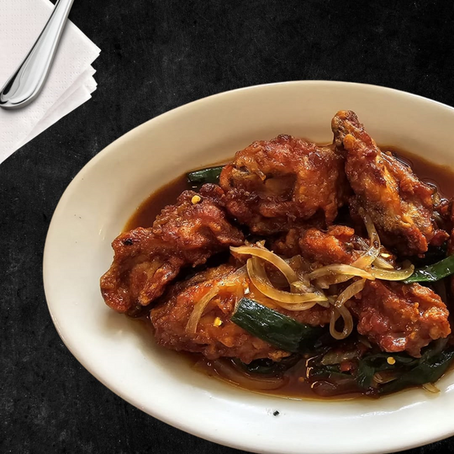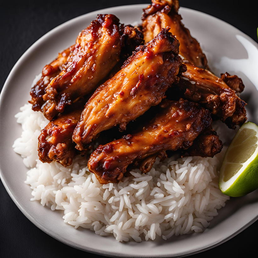 Ingredientes principales: Alitas de pollo picosas preparadas con cebolla cambray/blanca y salsa sambal acompañadas con arroz blanco.