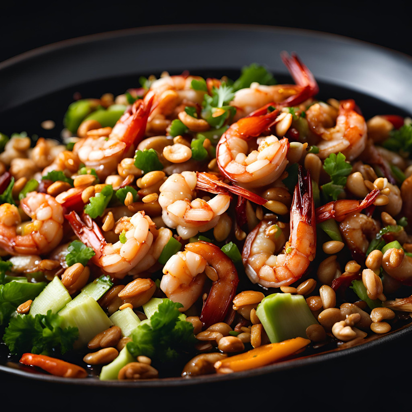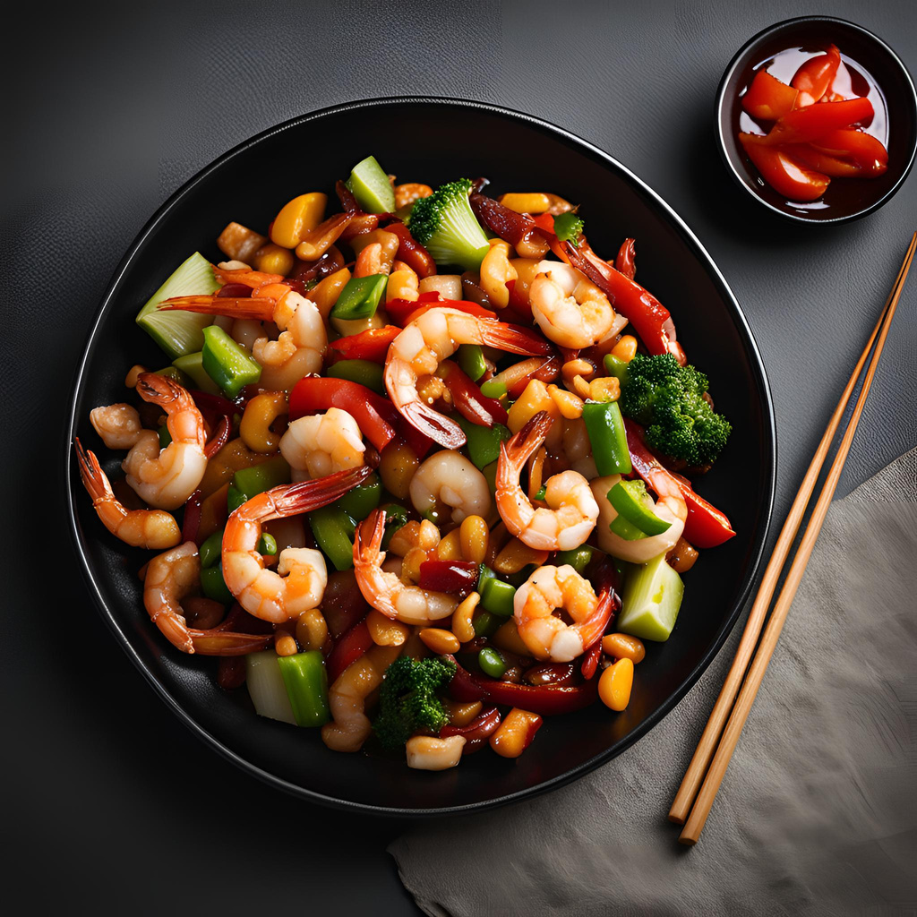 Ingredientes principales: Camarón preparado en salsa de la casa con pimientos verde/rojo, cacahuates , chile de árbol, cebolla y bambo shoots.