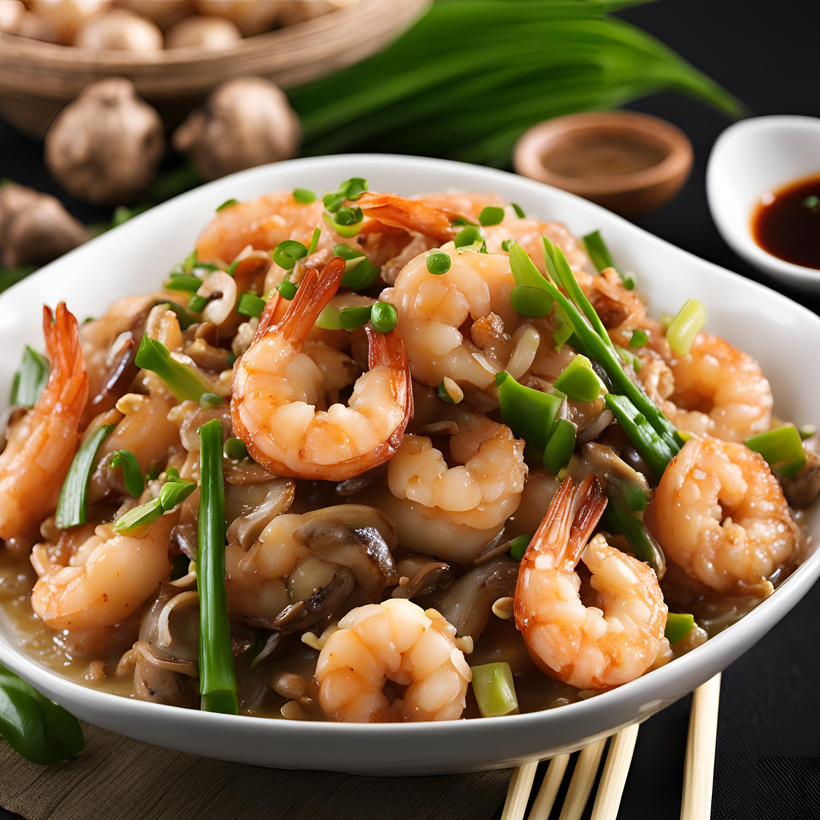 Ingredientes principales: Camarón preparado en salsa de la casa con champiñones, cebolla cambray y bambo shoots