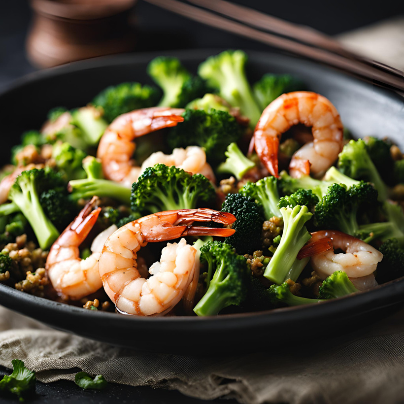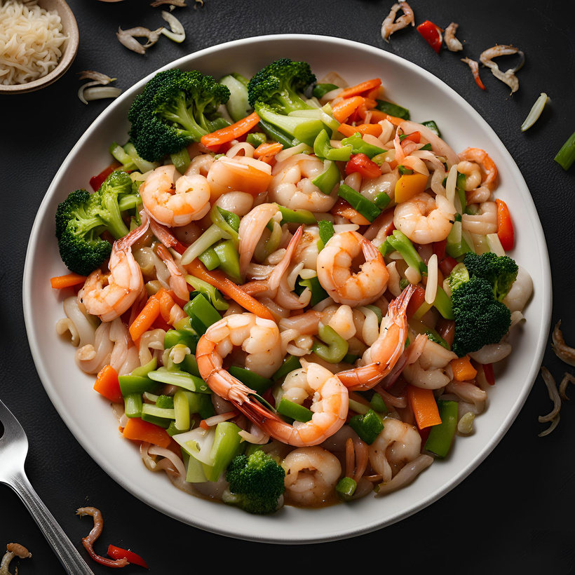 Ingredientes principales: Camarón preparado con brócoli, zanahoria, pimientos, bambo shoots, champiñones y elotitos.