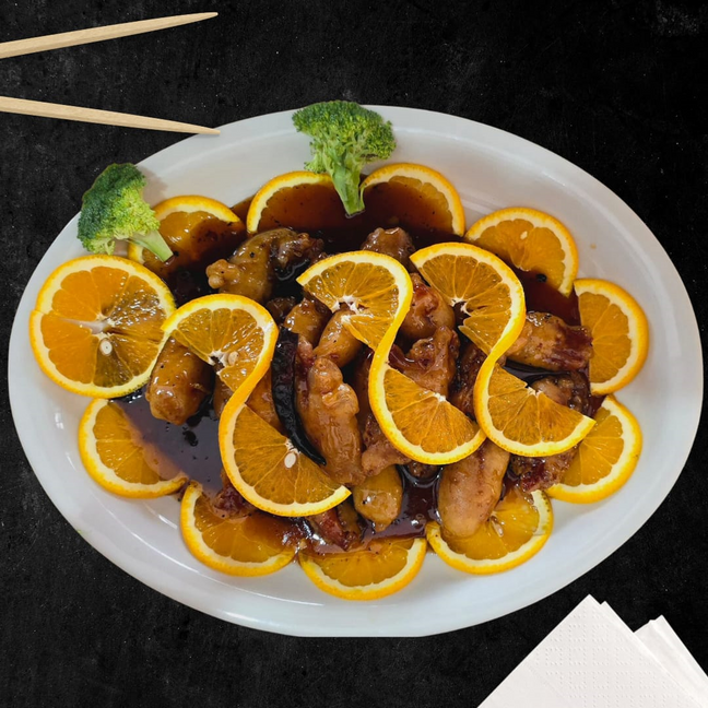 Ingredientes principales: Camarón empanizado preparado en salsa especial, naranja y chile de árbol.