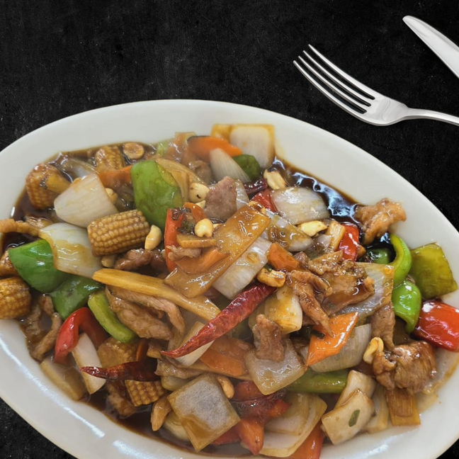 Ingredientes principales: Pollo, Res y Camarón preparado en salsa de la casa con pimientos verde/rojo, cacahuates , chile de árbol, cebolla y bambo shoots.