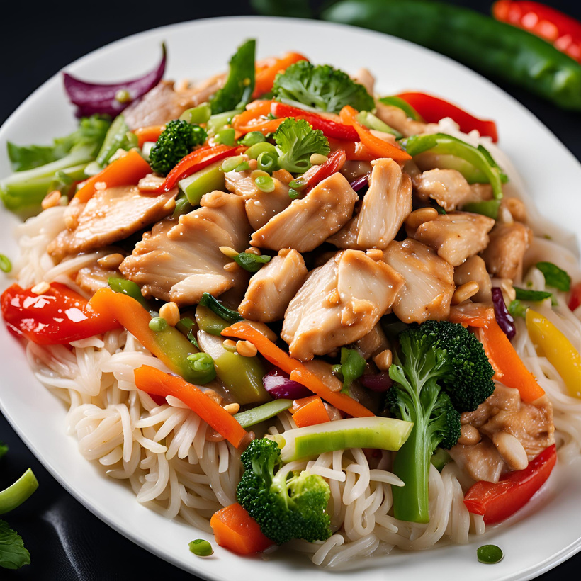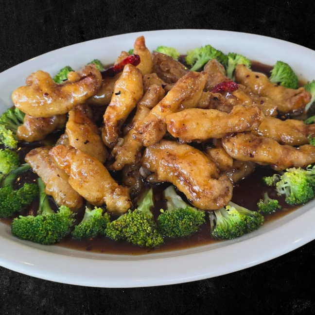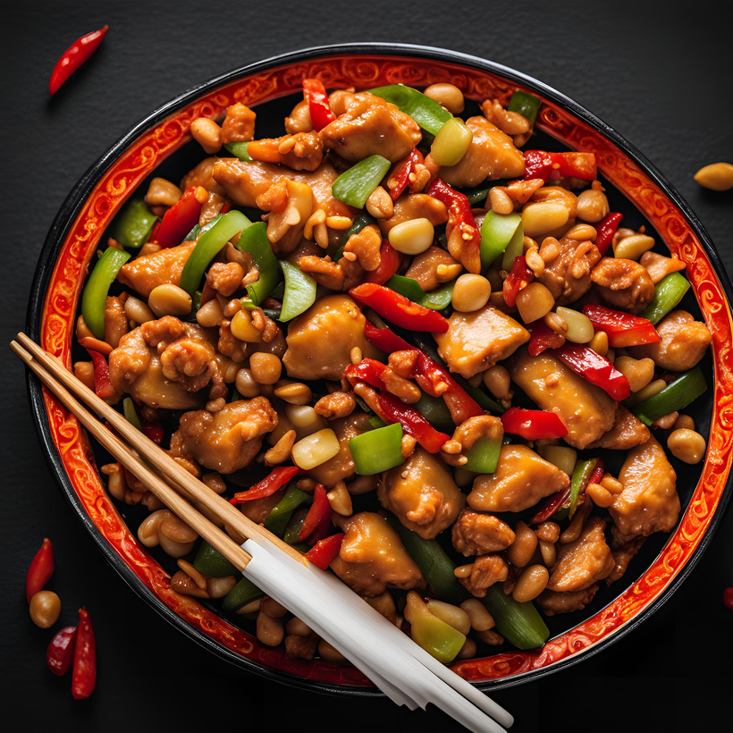 Ingredientes principales: Pollo preparado en salsa de la casa con pimientos verde/rojo, cacahuates , chile de árbol, cebolla y bambo shoots.