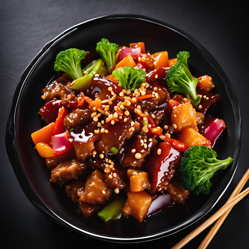 Ingredientes principales: Pollo empanizado preparado con chile morrón, zanahoria, cebolla y piña.